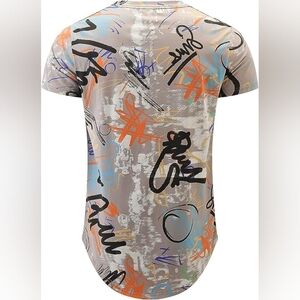 Introducing the new men's graffiti artwork shirt available in multiple sizes. It's made from a blend of 95% cotton and 5% spandex for comfort and moderate elasticity. You can find detailed size information in the provided picture. The T-shirt showcases the latest fashion with its comfortable fabric and digital printing process. Designed with contours and side seams, this stylish T-shirt includes classic features like double-needle sleeves and a high-low hem for lasting quality.