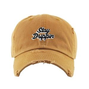 - Color: Rustic Hat with Black Writing Embroidered Displaying "Stay Drippin" with White Embroidered Thread Outline On Text
