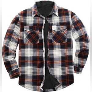 Men's buffalo plaid fleece sherpa lined jacket with button front and two chest flap pockets as well as two side slit pockets to put your items in,easily leaving your hands free.