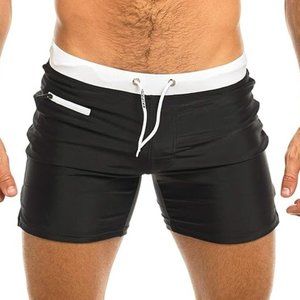 New in the bag, we opened up the bag to take the photos but the swim shorts are in nice shape. Black with white trim. 83 percent nylon and 18 percent spandex. A small zipper pocket is found on the front. In size Medium for us size. They are lined with 100 percent polyester.