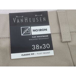 New Mens Van Heusen No Iron Khaki Tan Pants Flex Waistband Classic Flat 38x30