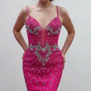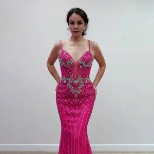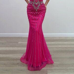 Exuding pure sophistication, this mermaid gown captivates with its illusion deep V-neck and figure-sculpting silhouette. Embellished with shimmering rhinestones, beads, and sequins, it radiates an ethereal glow that enchants with every movement. A discreet zip closure completes the look with seamless elegance.
