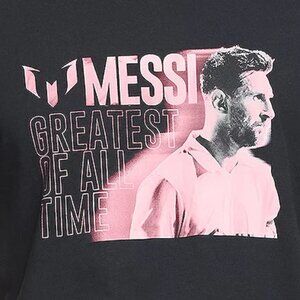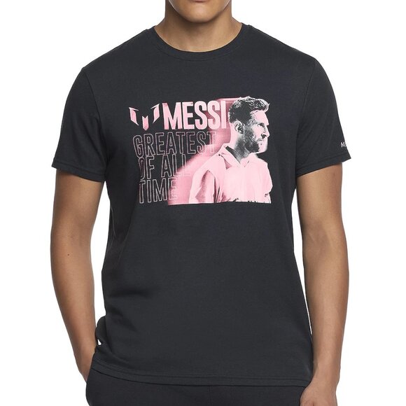 Brand new with tags, officially licensed men's size graphic tee in black 100% cotton fabric with an image on chest of Argentina superstar Lionel Messi in pink with his logo and name and the words Greatest of All Time next to it, along with the Messi name in raised letters on one sleeve as well.