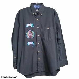 New Mexico Jemez Pueblo Native Art Long Sleeve Button Down Western Dress Shirt. Black 100% cotton Long sleeve Button Down shirt screen printed purple and blue native southwest design, 'Red Road' by artist George Toya, Shades of the Southwest Gallery Jemez Pueblo, NM 1999. Men's size Medium. Excellent gently worn condition.