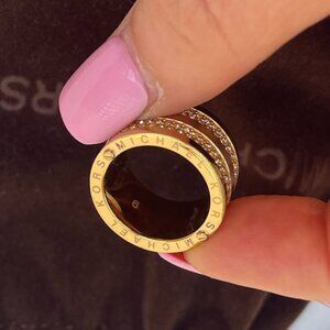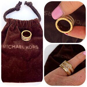 New in giftable pouch Stunning! Michael Kors Wide Ring 14ct yellow Gold Plated Cubic Zirconia Stone Set, size 6. Ring features allover pavé white Cubic Zirconia, brushed yellow gold center band, & 'Michael Kors' engraved on the edge of the ring. Ring width is 1/2 inch.