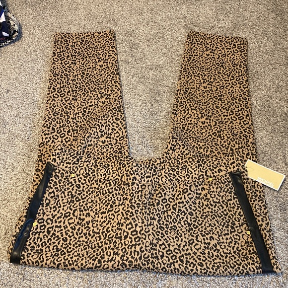 Chic camel leopard print pants with sleek accents. Ideal for a trendy look.