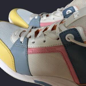 NEW! Michael Kors Georgie Wedge Sneakers in a beautiful mix of white, pink, blue, yellow, and orange pastels. Features mirror metallic accents, vachetta leather, and a sporty 2” wedge heel. Super chic and comfortable!