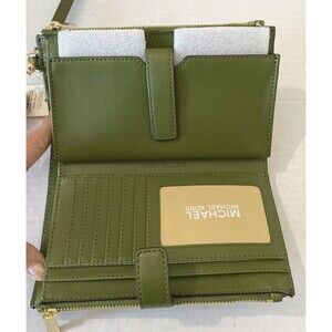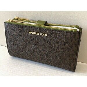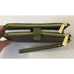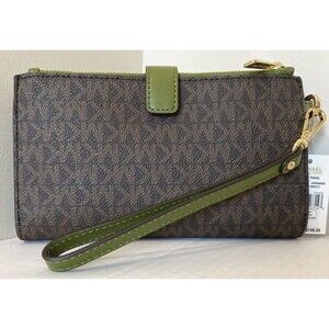 New Michael Kors Jet Set Travel Double zip wristlet wallet PVC Brown / Evergreen