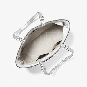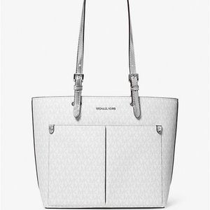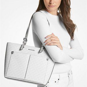 New Michael Kors Jet Set Travel Medium Double Pocket Logo Tote Optic White