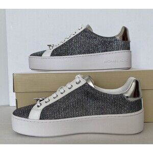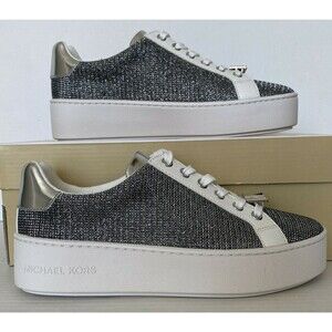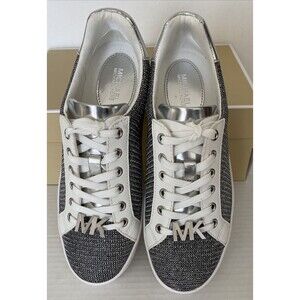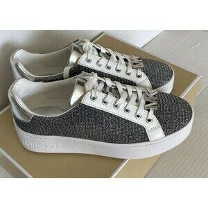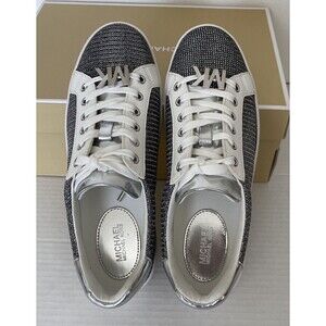 New Michael Kors Poppy Lace up Glitter Chain Mesh sneakers size 5.5 White Silver
