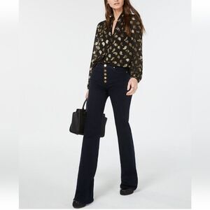 New with Tag Michael Michael Kors Selma Carpenter Dark Gary Wash Flare Jeans Retails for $125! Dark grey wash with black hints, flattering Flare leg High rise Gold tone carpenter button up fly Slim thru hip and thigh with flare at bottom Belt loops, pockets in front and patch pockets at back Size 10, approx 32" inseam and approx 10.25" rise Perfect for all seasons! Modern flare leg adds some style to this staple piece. Model photo to show fit Non smoking, no pet home. Offers accepted. staple classic designer minimalist modern trendy flared jean denim grey mk winter spring summer fall retro 70s