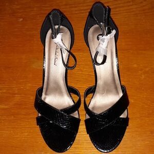 New with the ankle straps still wrapped up. Reptile embossed pleather heels. Size 10. Heel is 3.25" high. Thanks for looking!