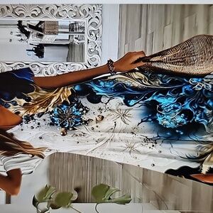 This coverup has gorgeous colors of blues, tans, black, gold & silver.