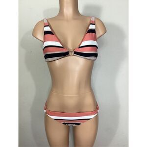 New. Milea stripe bikini set in clay, black, white and tan. Rose gold metal on the clasp, and at the end of the adjustable two-way straps. Ring detail in the front. This is a high-quality Australian brand of resort swimwear. The fabric is a waffle texture and is very soft. Fully lined. This is marked a size 14 which is a USA size 10. The top is missing its tags so please check measurements but it fits my manikin like a medium. Soft removable pads. Very nice swimsuit. Love it.