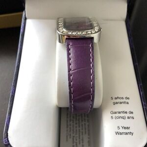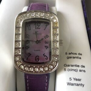 New Minicci Purple rhinestone fashion watch, brand new in box, still has protection on winder but has been in storage so not sure if battery is still good or not but watch never worn. From a smoke free home.