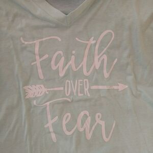New. Cute Mint Green V-NECK T-SHIRT that says "Faith over Fear". Tag says 3x but fits like a Large. Measurements: Across Shoulder 19 inches, Across Bust 24, Length 28