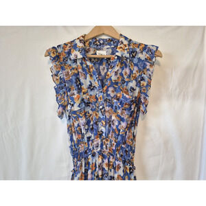 The New Misa Los Angeles Women's Trina Blue Pansy Floral Maxi Dress in size Medium is a beautiful and stylish piece perfect for casual occasions. This sleeveless dress features a collared neckline, flutter sleeves, and a pullover closure for easy wear. Made from polyester, the long maxi dress is adorned with ruffles and smocking details, adding a touch of flair to the floral pattern in a lovely shade of blue. The brand, Misa Los Angeles, is known for its quality and attention to detail, making this dress a desirable addition to any wardrobe.