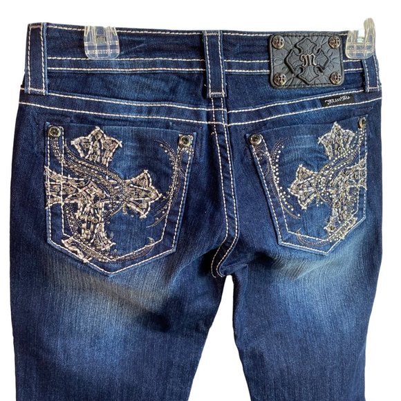 Miss Me Jeans for women, size 26, in a flattering skinny cut. Denim material with stitched cross pockets adds a unique touch to a classic design.