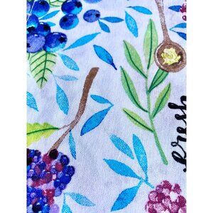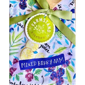 This set includes one cotton kitchen towel and one wooden spoon. The towel has a colorful fruit theme and says Mixed Berry Jam on the front. The kitchen towel is standard size and has a hanging loop at the corner. The wooden spoon measures 12” long. The set is all tied up with a green ribbon, ready for gift giving.