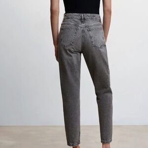 100% Cotton. Recycled cotton-blend fabric. Denim style cotton fabric. Mom-fit. High waist. Five pockets. Loops. Zip and one button fastening. Inseam 27.56 in. The model is 177 tall and is wearing a size 36. Fits small to size