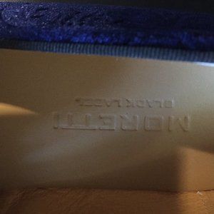 Beautiful scroll design blue velvet loafers with blue soles. Moretti's Black Label design, made in Italy. New without box, these are gorgeous, I believe they retailed around $430. They don't have a width listed, but look like a standard/medium width. The outsolde measures about 11.75 inches in length.