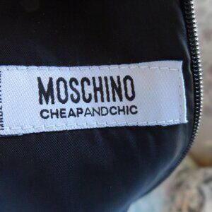 Sophisticated with a playful twist, this New Moschino Cheap and Chic black sheath dress is a standout piece. Expertly crafted in Italy, it features a dramatic stand-up collar adorned with glossy black beading and finished with a charming front fabric bow—adding a touch of signature Moschino whimsy. Fully lined.