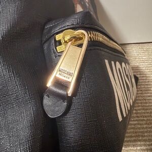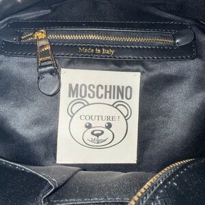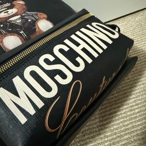 Black coated canvas and leather trimmed. Moschino Teddy Bear and logo print.