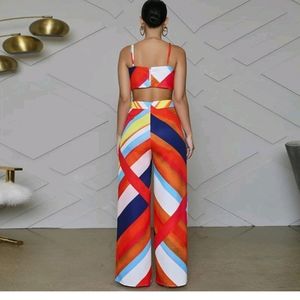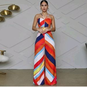 Beautiful multicolor halter jumpsuit with contrasting color. The suit exposés the sides and lower back for an elegant look perfect for any occasion. very breathable material Spring Ready. Summer ready. Comfortable jumpsuit. Light weight. New item.