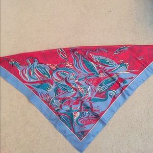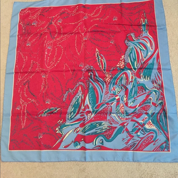 Large square scarf measures 30 x30". Deep red with light blue border. Blue green and cream pattern on one corner. Purchased in Holland never worn.