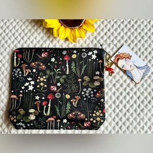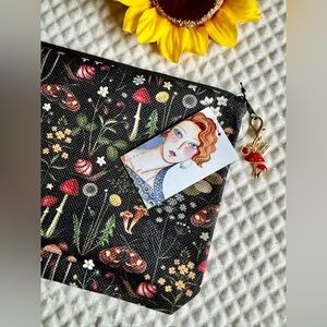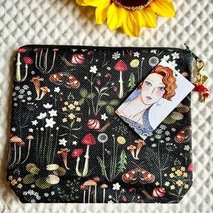 This zippered bag features a mushroom core botanical print with flowers, snails, mushrooms, and dandelions on a dark background. The bag is printed on both sides. It has a zipper with cute removable mushroom zipper pull.