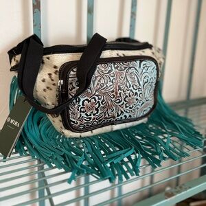 New Myra Bag Turquoise emboss Fanny Waist Sling Pack Fringe Cowhide Genuine