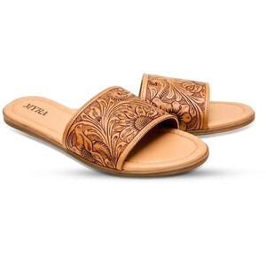 New Myra Hand-Tooled Brown Leather Slide Slip-on Sandals