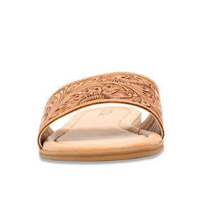 New! Myra Hand-Tooled Brown Leather Slide Sandals