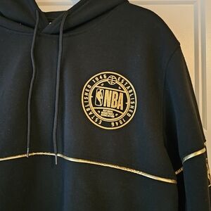 New Black Hoodie with Drawstrings, Gold Piping, NBA Emblem on Left Chest Area and Left Sleeve. Front Zip Pockets with Soft Fleece Lining. 100% Polyester Material.