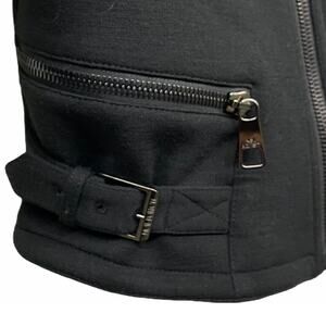 NEIL BARRETT Jersey Moto Jacket Wool Blend Black Coat XL New without tags excellent condition writing on tag as shown Asymmetrical front zip closure Stand collar with snap closure Zipper cuffs Front zip pockets Adjustable buckle side tabs 45% virgin wool, 45% acrylic, 8% polyamide, 2% elastane Size XL Chest: 20 1/2" Length: 26" Sleeve: 25 1/4" All measurements taken laying flat