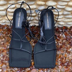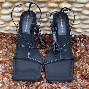 New (NIB): Good American Caged Slanted Sandals in Neoprene Black size 7.5. Heels that set the bar high and never let you down. Meet the Neoprene Lace Up Sandal. Where comfort meets sexy. Neoprene base stress test reinforced heel. Leather lace up ankle straps. Square Toe Cloud sole for all day comfort. Heel 100mm / 3. 94 inches
