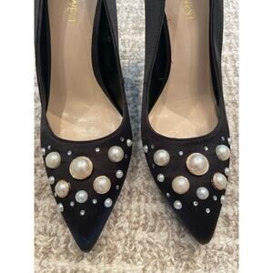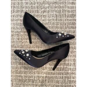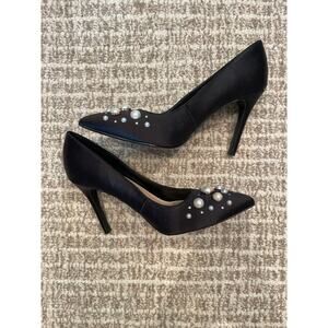 New NINE WEST Black Satin 3.5” heels with pearl/Rhinestone Studs Sz 6