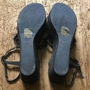 Dark gray suede platform wedge sandal with sparkly crystal rhinestone mesh diamonte diamond-shaped detail by Lola Cruz, Spain