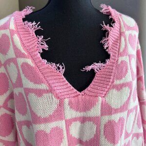 New NWOT Pink White Heart Hearts Distressed Valentines Sweater XL Extra Large