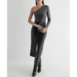 Add sleek, modern flair to your wardrobe with this Express Body Contour Bodysuit in Gunmetal. Crafted from silky shine fabric, this one-shoulder, long sleeve bodysuit features a double-layered design for a smooth silhouette. Perfect for a night out with denim or faux leather.
