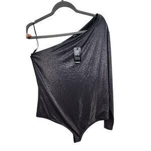 New NWT Express Body Contour One Sleeve Metallic Thong Body Suit XL Black Silver