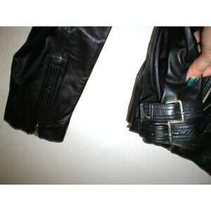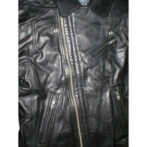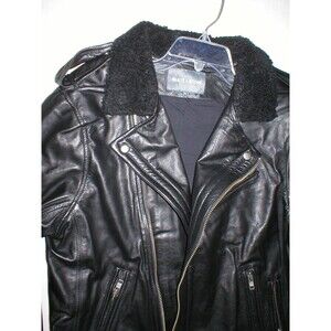 Leather jacket Notch lapel with faux shearling trim and snap tab options Slant zip chest pocket and side slant zip pockets Zip cuffs Buckled hem Tonal top stitching and panel seaming Zip front closure Fully lined Great for any time of day or pa