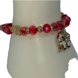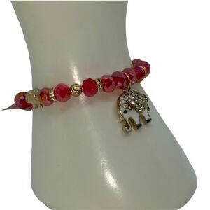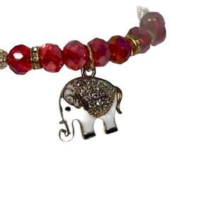 New NWT Red Beaded Gold-Tone Rhinestone Elephant Pendant Stretch Bracelet