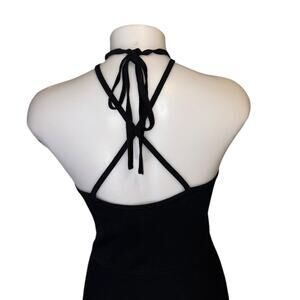New with tags attached, ribbed knit black strappy midi dress, halter strap around neckline, a-line style, fitted bodice. Holds its form and fits the body beautifully.