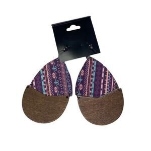 New NWT Wooden Fabric Covered Boho Aztec Dangle Earrings Purple Multicolor