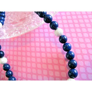This beautiful necklace features Natural Brazilian Deep Blue Lapis Lazuli beads as well as Silver Stardust Beads and a Sterling Silver 925 Lobster Clasp closure. Lapis Lazuli typically has some Iron Pyrite in it which adds to the character of the stone and gives off a bit of shimmer.