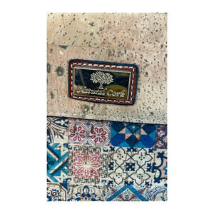 Multi colored geometric cork design on the front. Cork on the back and leather straps and bottom.