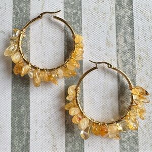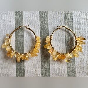 New Natural Yellow Citrine Stone Wire Wrapped Gold Tone Hoop Earrings - 2”