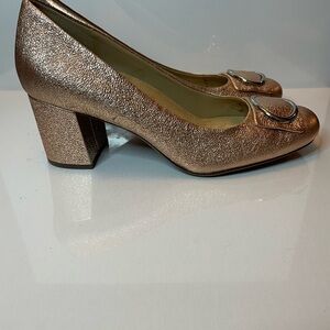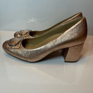 These Naturalizer rose gold flats boast a sleek metallic finish, adding a touch of elegance to any ensemble. With a classic round toe design and a subtle decorative element on the toe area, they are perfect for both casual and formal occasions. The flat sole ensures comfort, making them a versatile addition to your wardrobe. New with out box