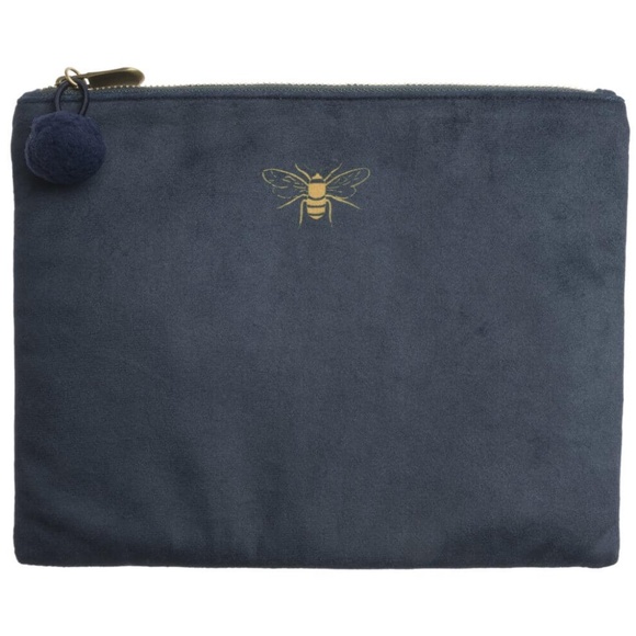 A beautiful Navy velvet pouch which features a pom pom detail on the zip and a Bee illustration in the centre. Perfect for keeping your phone, purse and accessories in, using as a makeup bag or even a clutch.